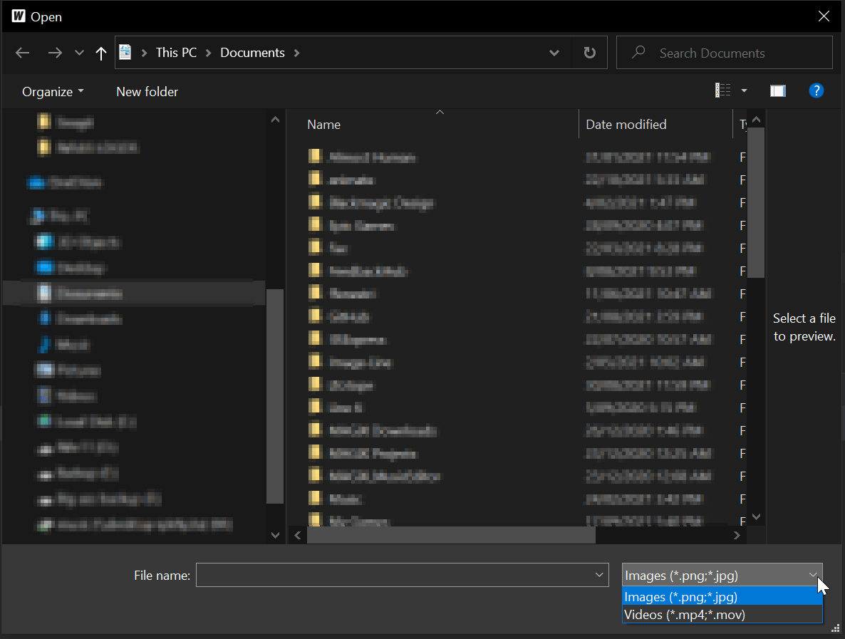 Isso resultará na caixa de diálogo Abrir Arquivo usando *.png,*.jpg,*.mov,*.mp4 como filtro.